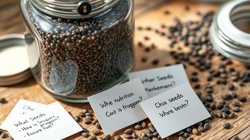 Think of your chia seeds as tiny treasures that need proper protection. To maintain freshness, store them in an airtight container in a cool, dark place like your pantry. Use clear, resealable jars for easy access and freshness preservation. Keep them away from heat, light, and moisture, which can cause spoilage. Follow these storage tips, and your chia seeds will stay fresh and ready to boost your meals whenever you need them.