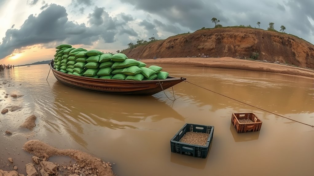Imagine a river as a highway, and when its level rises, alternative routes become your new pathways. During high river levels, you can reroute your chia seed shipments via inland roads, railways, or even air freight. Employ river level strategies like monitoring water gauges and coordinating with transport authorities to make certain of smooth transit. These alternative routes help you avoid flood-prone areas and keep your chia seed deliveries on schedule.