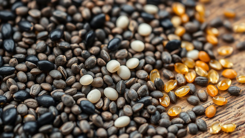 Chia seeds come in black, white, and golden varieties, each with slight visual and flavor differences but similar health benefits. Black chia seeds are most common and versatile, while white ones are prized for their mild taste and appearance calming. Golden chia seeds offer a nuttier flavor and a vibrant hue, often seen as premium options. If you want to explore how these varieties can suit your needs, there’s more to discover beyond the surface.