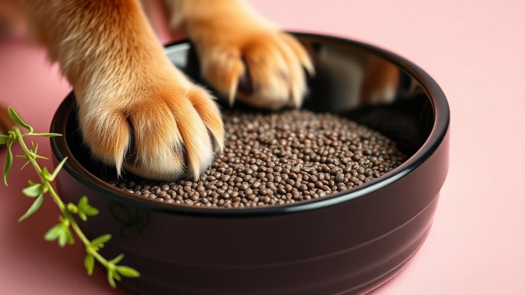 Think of chia seeds as tiny ships sailing into uncharted waters. Some pets, like sailors, might encounter storms—pet allergy symptoms or unexpected chia seed reactions—that indicate they’re allergic. While most pets tolerate chia seeds well, a few could develop symptoms like itching or digestive upset. Always monitor your pet closely after introducing new foods, and consult your vet if you notice any pet allergy symptoms or unusual reactions.