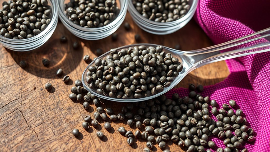 Chia seeds are small but powerful nutritional boosters, and understanding proper serving sizes is key to maximizing their health benefits. When you get the hang of how much to eat, you’ll be able to enjoy their full nutritional potential without overdoing it. A typical serving size of chia seeds is about one to two tablespoons, which provides a good balance of nutrients without causing digestive discomfort or excess calorie intake. This small amount packs a punch, offering fiber, omega-3 fatty acids, protein, and essential minerals like calcium and magnesium. Consuming the right portion ensures you experience their nutritional benefits fully, whether you’re adding them to smoothies, yogurt, or oatmeal. Knowing proper serving sizes also helps you manage your overall calorie intake, especially if you’re watching your weight. Since chia seeds are calorie-dense—roughly 60 calories per tablespoon—you don’t need a large amount to gain their health benefits. Eating too much at once, however, can lead to bloating or digestive issues because of their high fiber content. It’s best to start with small servings and gradually increase as your body adjusts. This way, you can enjoy their nutritional benefits without discomfort, and it helps you develop a sustainable habit. Additionally, understanding the fiber content of chia seeds can help you better appreciate their role in promoting satiety and weight management. Storage tips are just as important as knowing your serving size. To maintain their freshness and nutritional quality, store chia seeds in an airtight container in a cool, dark place, such as a pantry or cupboard. Proper storage prevents exposure to light, air, and moisture, which can degrade their nutrients over time. If you buy in bulk, transferring chia seeds into smaller containers makes it easier to access a portion while keeping the rest sealed tightly. For longer shelf life, you can also refrigerate or freeze chia seeds, especially if you don’t plan to use them frequently. Just ensure they’re stored in a moisture-proof container to prevent clumping or spoilage.