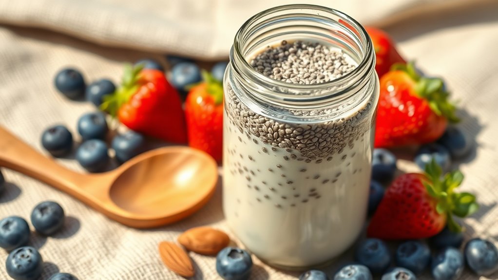 When traveling, feeling bloated or irregular can be frustrating, but portable chia snacks can help keep you regular. You can easily prepare chia pudding with milk and fruit, or make energy bites with nuts and oats for a fiber-packed boost. Carrying these snacks guarantees you get the benefits of fiber, omega-3s, and protein even on busy days. Keep exploring for simple ideas to incorporate chia into your travel routine and stay comfortable on the move.