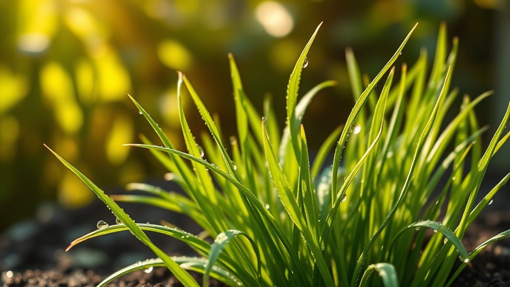 When watering your chia plants, keep in mind that they like consistent moisture but dislike waterlogged soil. Too much water can lead to root rot, while too little causes the plants to wilt and produce poor seed production. Regular, moderate watering guarantees the soil remains evenly moist without becoming soggy. Mulching around the plants can help retain soil moisture and prevent rapid drying, especially during hot, sunny days. Remember, consistent watering not only sustains healthy growth but also helps prevent pest problems. Stressed plants are more vulnerable to pests, so maintaining ideal moisture levels is essential for pest control.