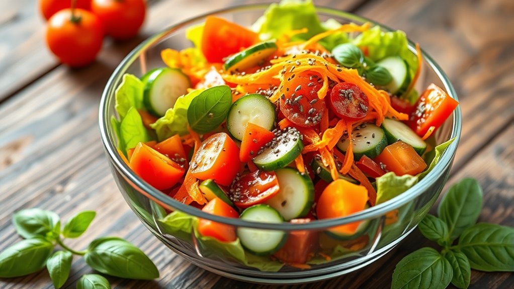 Boost your vegan salads by adding chia seeds, which are packed with omega-3s, fiber, and protein. You can sprinkle them directly over greens or soak them first to create a gel that thickens dressings and adds texture. Chia seeds also act as natural binders, helping ingredients stay together while boosting nutritional value. Want to discover more simple ways to elevate your salads? Keep exploring for tips to make your meals even healthier.