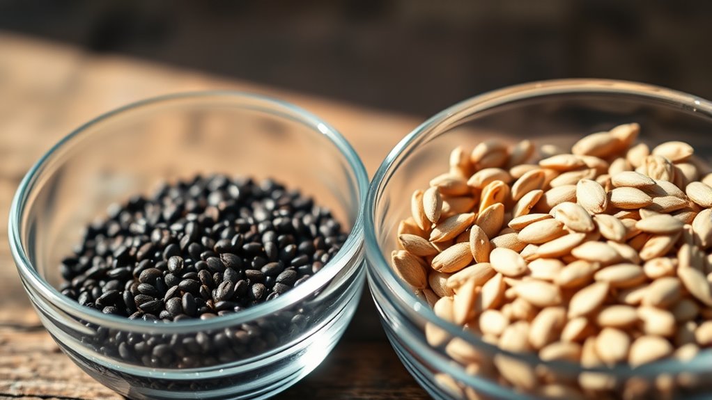 Chia seeds and hemp seeds each bring unique benefits to your diet. Chia seeds are high in fiber, antioxidants, and can absorb liquids to help you stay hydrated, making them great for digestion and fullness. Hemp seeds offer complete protein and balanced omega-3 and omega-6 fatty acids to support overall wellness and muscle health. Exploring their differences can help you choose the best option for your nutritional goals—keep going for a closer look.