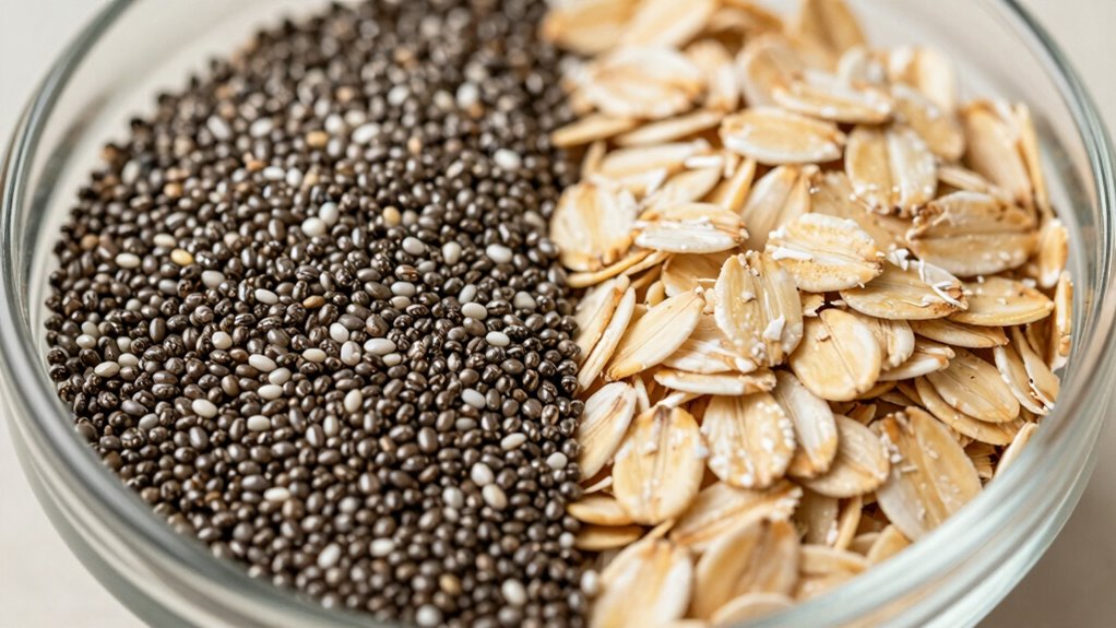 Absolutely, combining chia seeds and oats creates a fiber synergy that skyrockets your intake! You’re boosting your nutritional balance like never before, packing in more soluble and insoluble fiber than you’d get from either alone. This powerful combo helps regulate digestion, stabilize blood sugar, and keep you full longer. It’s a simple, delicious way to supercharge your diet, turning everyday meals into fiber-packed energy bombs.