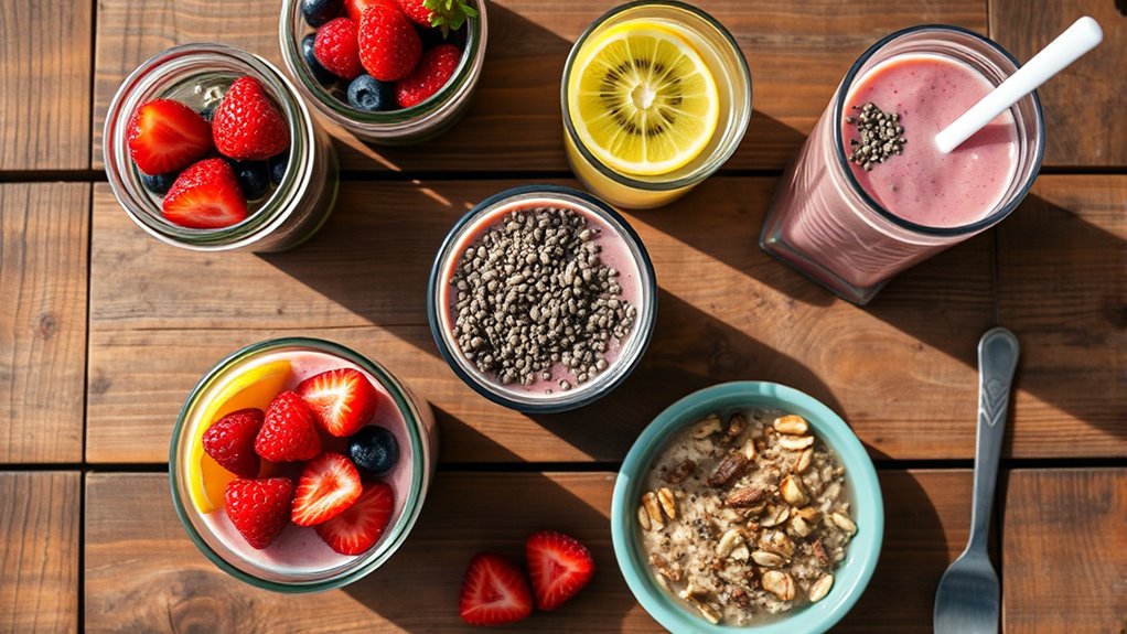 You can easily boost your meals by adding chia seeds in creative ways like tossing them into smoothies for extra fiber and omega-3s, mixing into baking recipes such as muffins or pancakes for added crunch and nutrition, or preparing a chia gel to thicken jams and dressings. Sprinkle them on yogurt or oatmeal, or use as an egg substitute in vegan dishes. Discover more inspiring ideas to incorporate these versatile seeds into your daily routine.