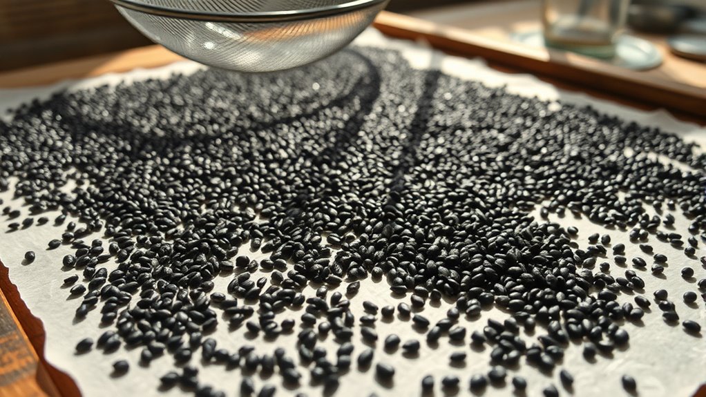Cleaning your chia seeds after drying is equally important. Carefully remove any debris, plant matter, or broken seeds that may have been mixed in during harvest. You can do this by winnowing—gently blowing away lighter chaff—or by passing the seeds through a fine sieve. Rinsing isn’t necessary unless you notice dirt or foreign particles, but if you do rinse, ensure the seeds are thoroughly dried afterward to prevent mold. Once cleaned and dried, store your chia seeds in airtight containers in a cool, dark place. Proper seed storage conditions help maintain freshness and extend shelf life, preserving their nutritional benefits for months.