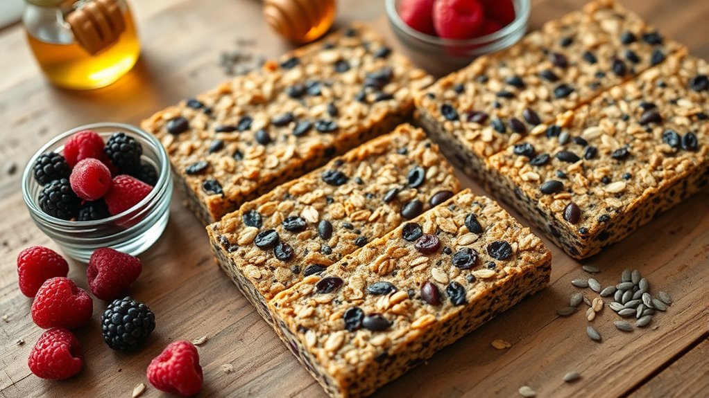 When it comes to snack ideas, these chia breakfast bars stand out because they are portable, filling, and packed with nutrients. They’re ideal for replacing less healthy options and can be enjoyed at any time of day—whether during a quick commute, mid-morning break, or post-workout snack. Plus, since you control the ingredients, you can avoid added sugars and preservatives often found in store-bought options. To keep your snack ideas fresh and accessible, proper storage tips are essential. Wrap each bar individually with parchment paper or place them in airtight containers, then store them in your freezer. This way, they stay fresh for weeks and are easy to grab when hunger strikes. When you’re ready to enjoy one, just take it out and let it thaw for a few minutes, or microwave it briefly for a warm treat.