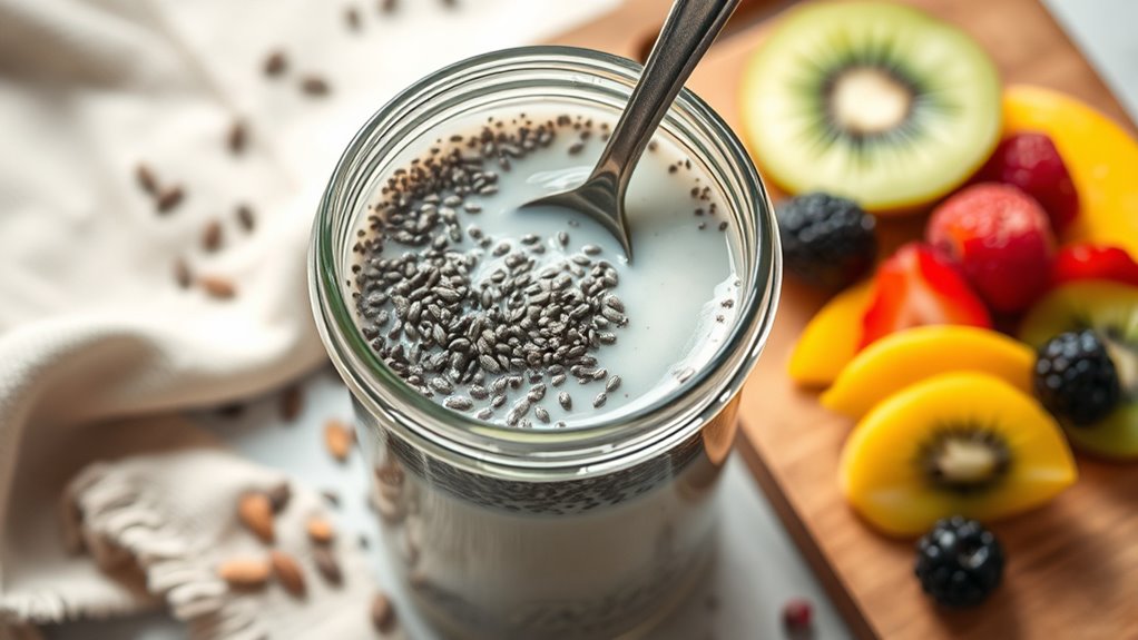 You can get creative with alternative liquids beyond water or milk, like fruit infusions or plant-based milks. Imagine turning your chia pudding into a tropical paradise with coconut milk or bursting with flavor using berry-infused water. These options not only add exciting flavors but also boost nutrition. So, don’t limit yourself—experiment freely to make your chia creations uniquely delicious and perfectly tailored to your taste buds!