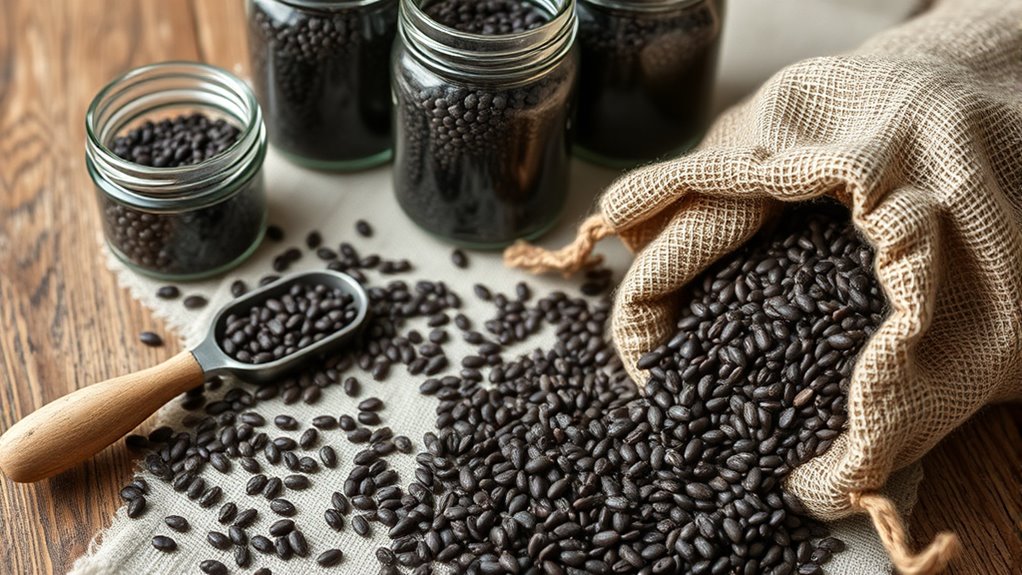 Storing your chia seeds properly is key to maintaining their freshness. Use airtight containers, such as glass jars with tight-fitting lids, and keep them in a cool, dark place away from direct sunlight and humidity. Proper storage prevents exposure to air and moisture, which can lead to spoilage or loss of nutritional value. It’s also helpful to label your containers with the harvest date, so you know when to use the seeds before they lose their potency. If you plan to store seeds for an extended period, consider refrigeration or freezing to further extend their shelf life and safeguard against pests. By following these harvesting techniques and storage tips, you guarantee your chia seeds stay fresh, nutritious, and ready for planting or culinary use next season.