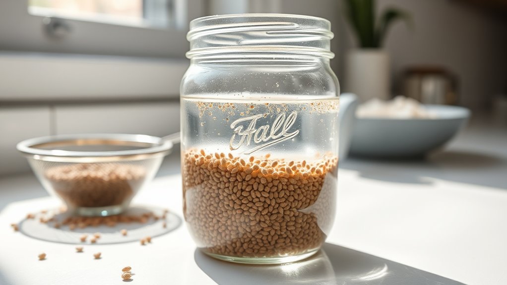 First, choose high-quality chia seeds from a reputable supplier to guarantee purity and freshness. While soaking is straightforward, sprouting requires a bit more attention. Start by placing about two tablespoons of chia seeds in a jar or a sprouting tray. Cover the seeds with about three times as much water, allowing them to soak for at least 30 minutes. During this time, the seeds will absorb water and expand. After soaking, drain any excess water thoroughly to prevent mold growth. Rinse the seeds with fresh water and drain again. This rinsing process is vital because it prevents bacteria buildup and keeps your sprouting environment clean.