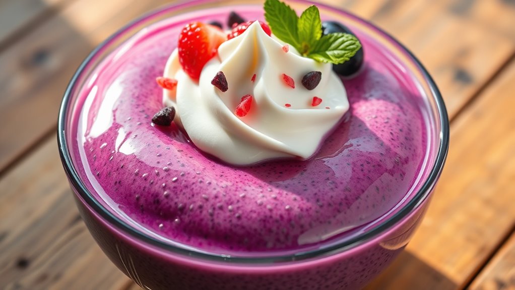 Beyond basic pudding, you can experiment with different chia seed variations to elevate your desserts. For example, blend in cocoa powder for a chocolate chia pudding, or swirl in fruit purees like mango or raspberry for added flavor and color. Incorporating spices such as cinnamon or vanilla extract can add depth to your plant-based pudding recipes. You might also layer the pudding with fresh fruit, nuts, or granola for texture and visual appeal. These combinations not only enhance flavor but also boost the nutritional value, making your dessert both indulgent and wholesome.