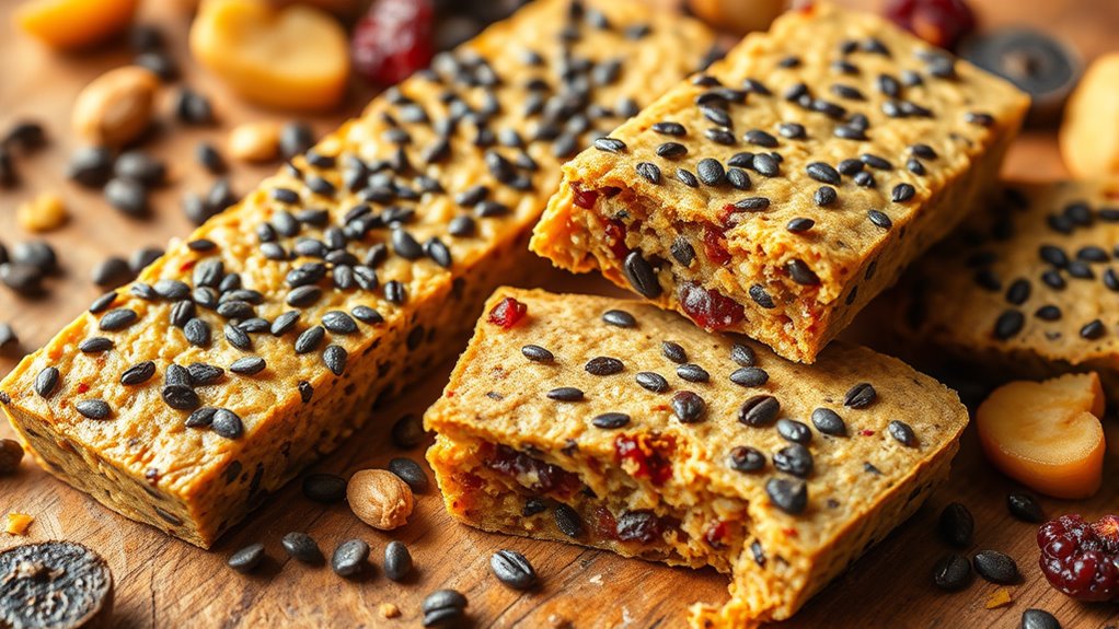 Incorporating chia seeds into your vegan energy bars and snacks is like planting tiny powerhouses that bloom with health. These little seeds act as your secret weapon, transforming simple treats into nutrient-packed treasures. With each bite, you’re fueling your body with nature’s hidden gems—like catching a burst of sunshine in every handful. So go ahead, embrace chia seeds, and turn your snacks into vibrant, energizing symphonies that keep you thriving all day long.