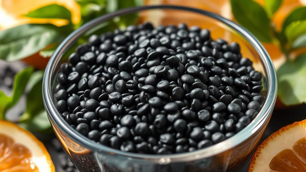 Chia seeds can help with blood sugar regulation by slowing down carbohydrate absorption, which prevents spikes. They also boost insulin sensitivity, making it easier for your body to manage glucose effectively. When you include chia seeds in your diet, you support stable energy levels and better overall blood sugar control. Just remember to consume them with water or other liquids for ideal benefits and to avoid any digestive discomfort.